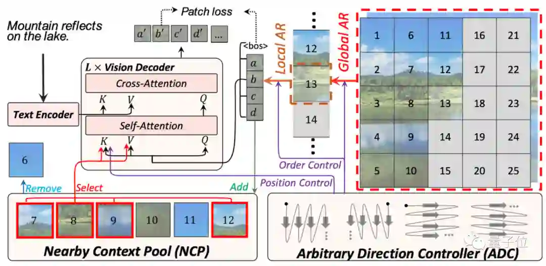 例如,在“补全图像”的过程中,图像推理是一圈一圈向外生成的;而在文本生成图像、或是视频文本生成时,这些推理的顺序又有不一样的变化: