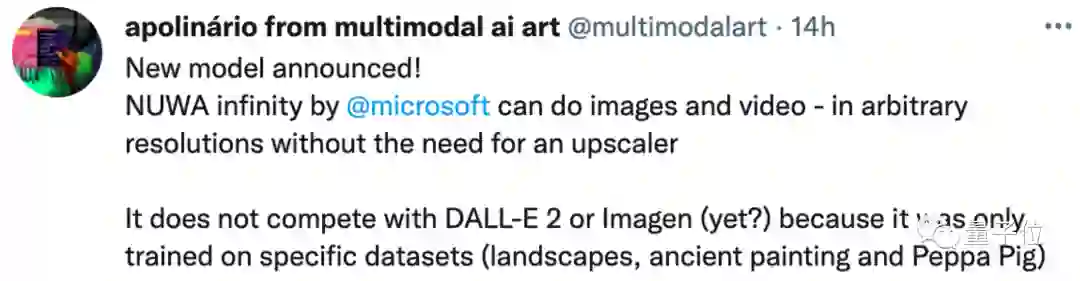 不过,NUWA-Infinity也还有一些局限性,例如与DALL·E2和Imagen不同的是,它是在特定数据集(清明上河图、小猪佩奇等)上训练的。