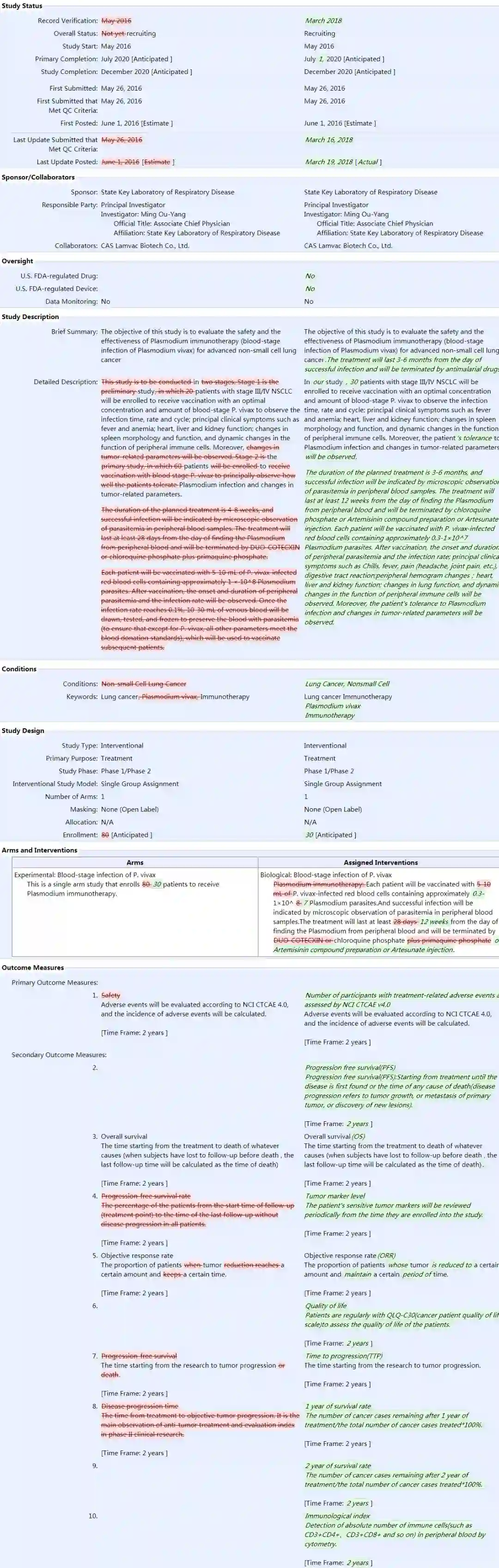根据Clinicaltrials的登记情况,中科蓝华生物科技有限公司(CAS Lamvac Biotech Co., Ltd)和广州医科大学呼吸疾病国家重点实验室(State Key Laboratory of Respiratory Disease)发起的临床试验方案显示,疟原虫治疗肺癌的方案改动较大,先后进行了5次修改:受试者从起初登记时的60名后改为30名;治疗周期长度从4-8周改为3-6个月(12周至24周);治疗效果周期即患者成功感染疟疾起初设置为28天后,改为12周(72天);在注射疟原虫的剂量上,前后也有变化,从1×108个疟原虫,改为0.3-1×107个疟原虫。
