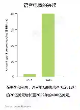 根据Juniper的数据,在美国和英国,语音电商的规模将从2018年的20亿美元增长至2022年的400亿美元。有趣的是,语音电商最热门的三大商品品类都是低价商品:生鲜杂货(20%)、娱乐(19%)和电子(17%)。