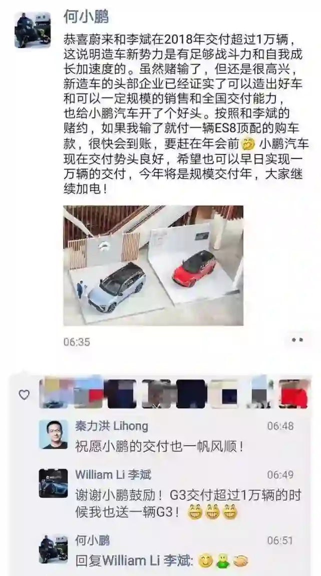 小鹏汽车董事长何小鹏通过微信朋友圈表示,“按照和李斌的赌约,如果我输了就付一辆ES8顶配的购车款,很快会到账,要赶在年会前。 小鹏汽车现在交付势头良好,希望也可以早日实现一万辆的交付,今年将是规模交付年,大家继续加电!”蔚来创始人李斌随后在此条信息下方进行评论,称谢谢小鹏鼓励,小鹏G3交付超过1万辆的时候自己也会送一辆G3给何小鹏。