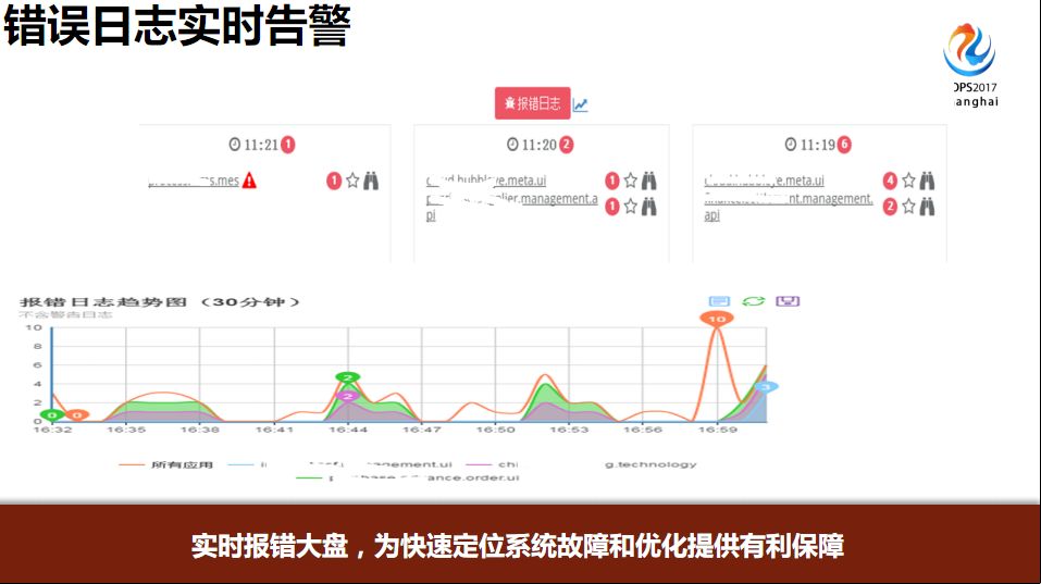 这个是给研发总监的,包括每个系统,各个研发部门,不同颜色标识着各个研发部门。通过技术的考量,通过数据去驱动技术升级,可以看到日志的趋势是明显变缓的,系统是越来越稳定的。