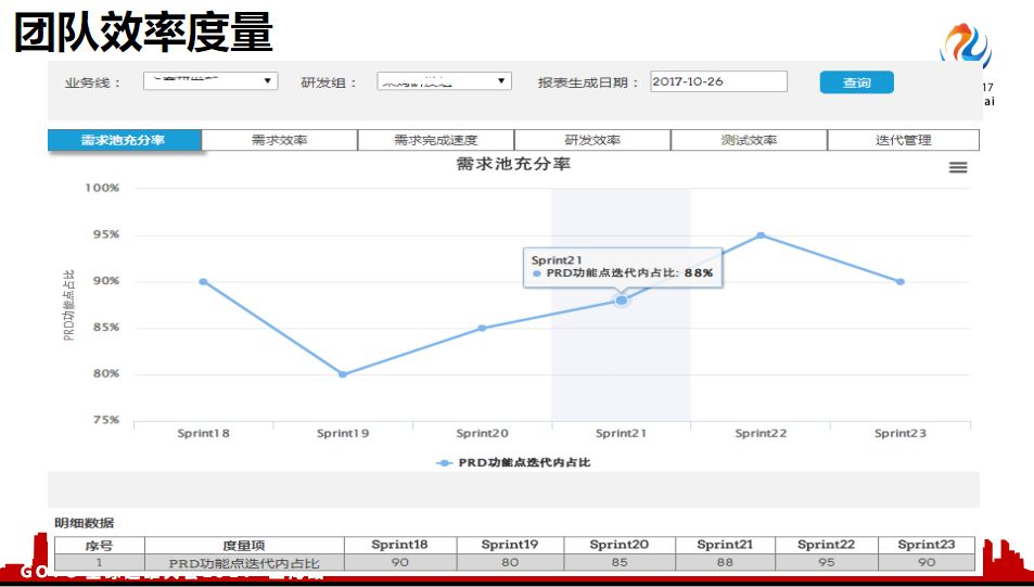 需求值是否充分,如果产品和研发部在一个部门的话,产品和研发永远是天地,总是相互打架。这个需求值就是说整个研发团队,收到的需求到底充不充分。能够度量团队到底饱不饱和,是否需要加人,不饱和是否给他多做一些培训。或者说长期不饱和的话,有的资源是否要调出,这仅是一个参考值。