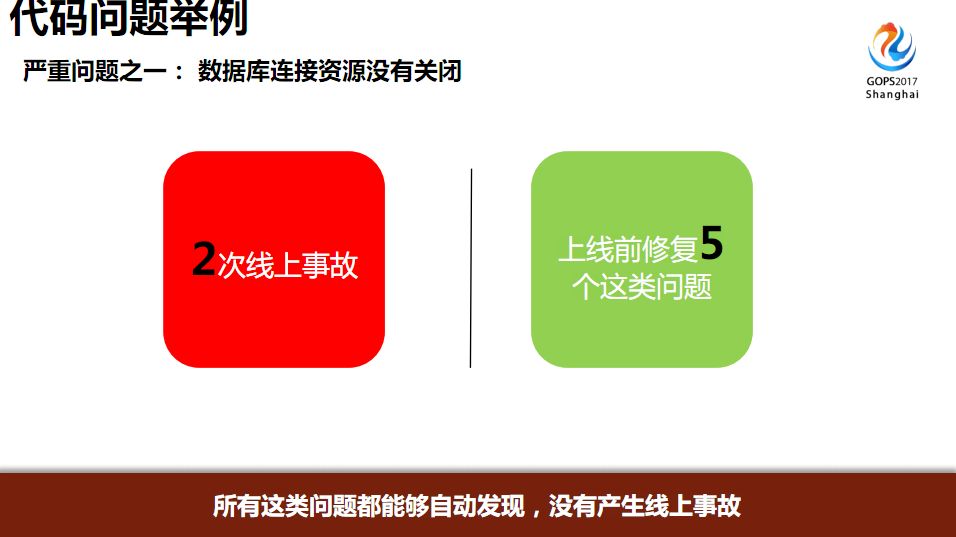 另外每周会统计新增代码问题的统计,展示最近修复率怎么样,新增了多少问题。为什么我能推动这个问题呢?因为我们产生了两次事故,我刚去的时候,由于数据库资源没有关闭,大家做技术应该知道,如果连接数据库,最后程序忘记关闭了,一般测试员测不出来,只有当量达到一定程度的时候会爆掉,我们产生了两次线上事故。我们每天交易额3到4亿,耽误5分钟是多少钱?耽误1小时是多少钱?后来加强这个问题以后,后来在扫码是直接扫出来了,我们已经修复了5个这样的问题,但从来没有在线上遇到过。自从推出这个标准之后,线上再没有出现这个问题。