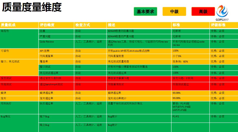 前面讲了领导比较关心的是效率、价值、质量。质量这里有13个纬度的数据,不同的研发水平不一样,所做的系统也是不一样的,对他也是提出不同的要求,要不然有的研发组是很LOW的。我们为什么把安全和性能放的低一点,是to B的,没有那么大的访问量,所以对于性能和安全没有要求那么高,to B也很难薅羊毛的进行攻击。因为我们大部分是在内网。