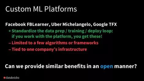 现在,Databricks 更进一步推出了 MLFlow(https://mlflow.org/)。MLFlow 意在将不同的机器学习框架由实验室整合应用到生产环境中,并通过 Hydrogen 项目(https://databricks.com/session/databricks-keynote-2)构建一种数据和处理的通用框架。