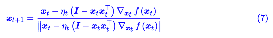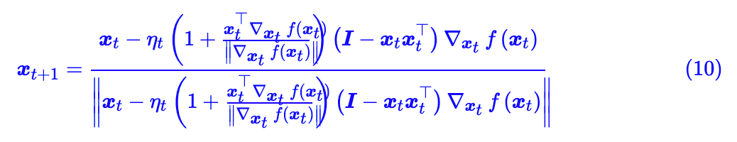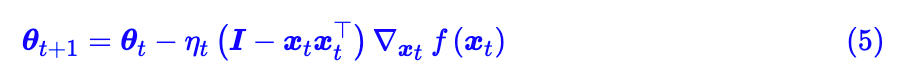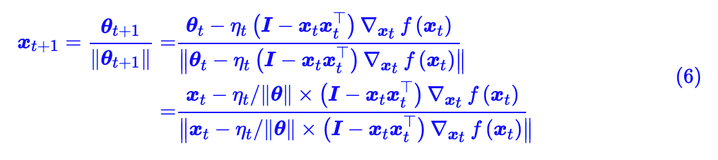 其中已经对部分变量进行了 x=θ/||θ|| 的替换,根据上述结果,梯度下降的迭代公式为: