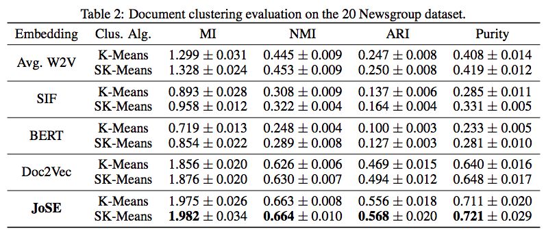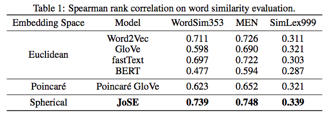 我试用了一下,训练确实很快速,训练好的词/句向量结果可以用 gensim 的 KeyedVectors 加载。另外我还看了一下源代码,很简练清晰,也方便做二次修改。至于实验结果,论文给出的词/句向量评测上面,JoSE 也是比较领先的: