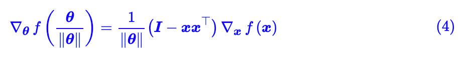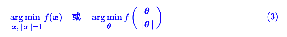 也就是说,我们可以将这个问题理解为带有约束 ||x||=1 的 f(x) 最小化问题,也可以通过设 x=θ/||θ|| 将它转化为无约束的 f(θ/||θ||) 最小化问题。由于带约束的优化问题我们不熟悉,所以只好按照后一种方式来理解。