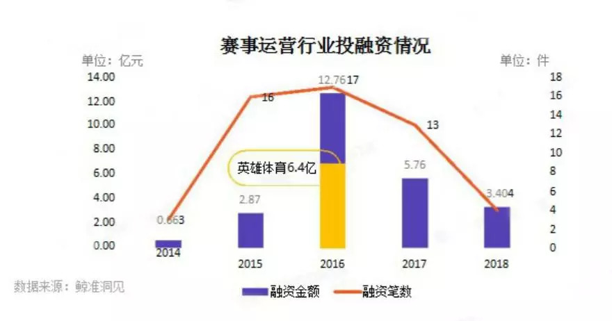 根据鲸准洞见的数据,电竞赛事运营行业14年开始萌发,15年迎来快速发展,融资次数达16次,行业在16年融资金额和融资笔数到达顶峰,融资总额为12.47亿元,其中英雄体育融资6.4亿元,融资笔数达17次。