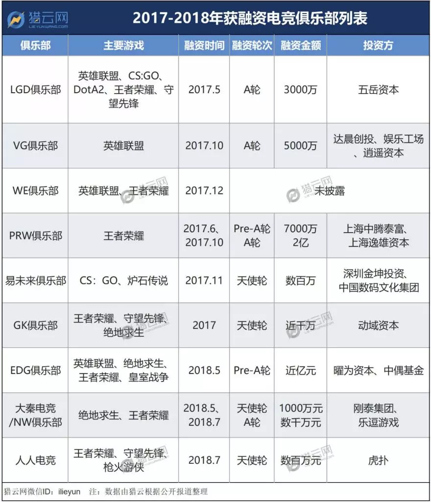 2017年是中国传统电竞俱乐部(以端游为主)纷纷脱离富二代注资、开始自主融资的一年,而2018年,则是新兴电竞俱乐部(以手游为主)跃上资本舞台的一年。