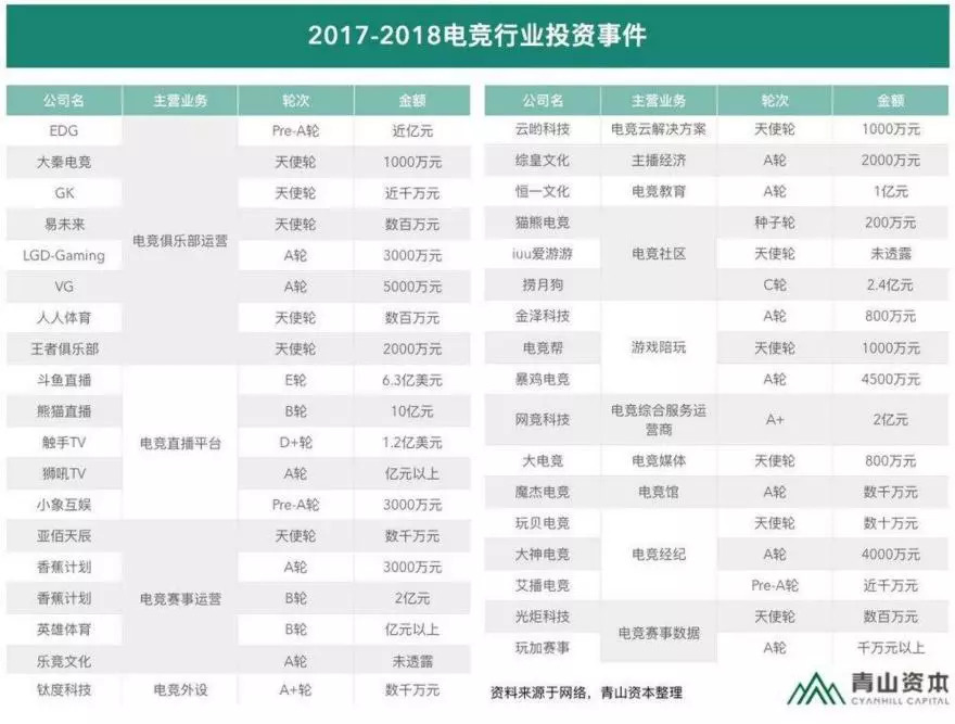 根据青山资本近日不完全统计的17-18年电竞行业投资事件表中,我们可以看到短短一年半间事件,电竞行业共发生了36起投资事件,金额将近80亿元人民币,对电竞行业的投资方向也越来越多元化。