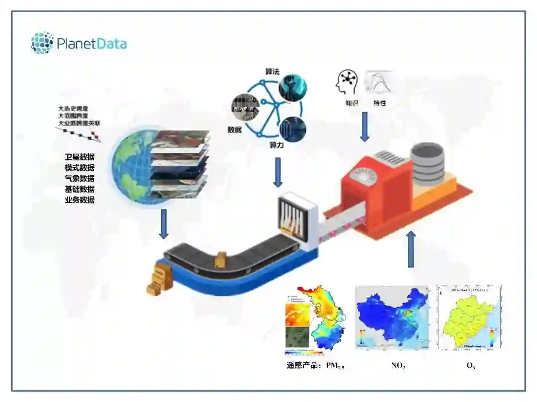 以卫星、近空、地面和人口等数据为参数的算法生产出的空气质量数据,目前行星数据可提供的数据产品有6种,包括PM2.5、二氧化氮、二氧化硫、臭氧、甲醛以及颗粒物组分。