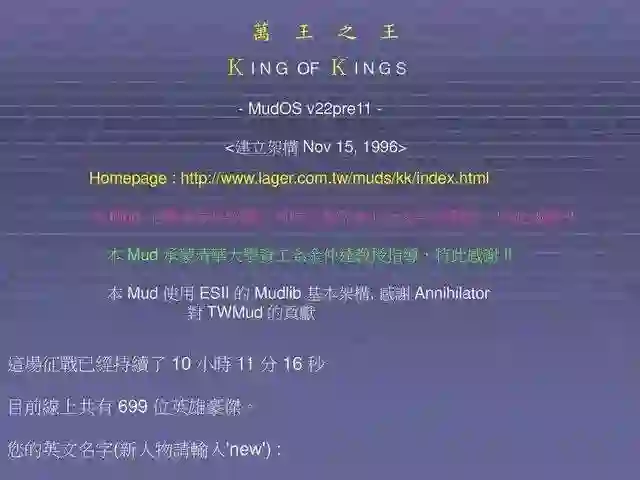 从那时起,《万王之王MUD》就有一个颇具野心的架构。游戏中的每一名玩家,只要条件允许,就可以成立国家,或者担当某个国家的大臣。而《万王之王MUD》中的一切,每一座城池,每一寸土地,都是由玩家自己建设,举国臣民共同努力的结果。