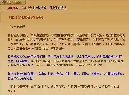 网游总有寿命。2004年10月1日,《万王之王》转为免费模式,吸纳了一批新用户,如此挣扎了2年,又于2006年10月11日正式停服。