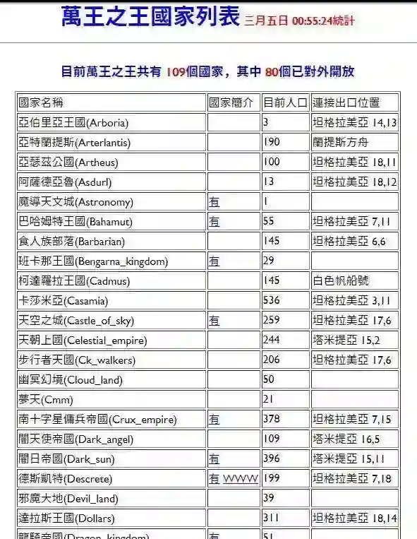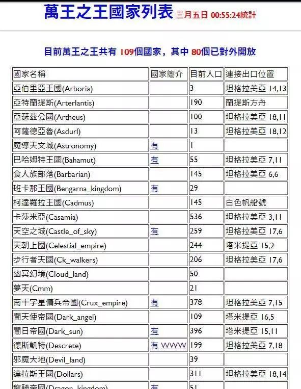 到1999年3月5日,《万王之王MUD》里已经有109个王国,每个王国的人数从一到数百人不等。字面上说,100个王国只是达成了“万王之王”愿景的百分之一,一国人口数量也相当寒碜。但这种人与人之间建立国家、相互争战的强社交联系,将成为未来十多年中国网游的缩影。