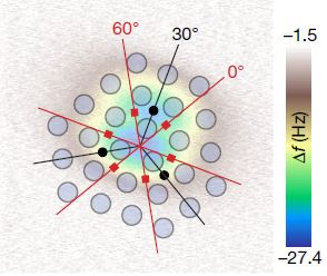 图 | PTCDA的不同“站立”角度。黑色圆点和红色方块代表了银原子与PTCDA可能的接触位置。在平移和旋转的过程中,PTCDA并不会跳过原子的表面。(图源:Nature)