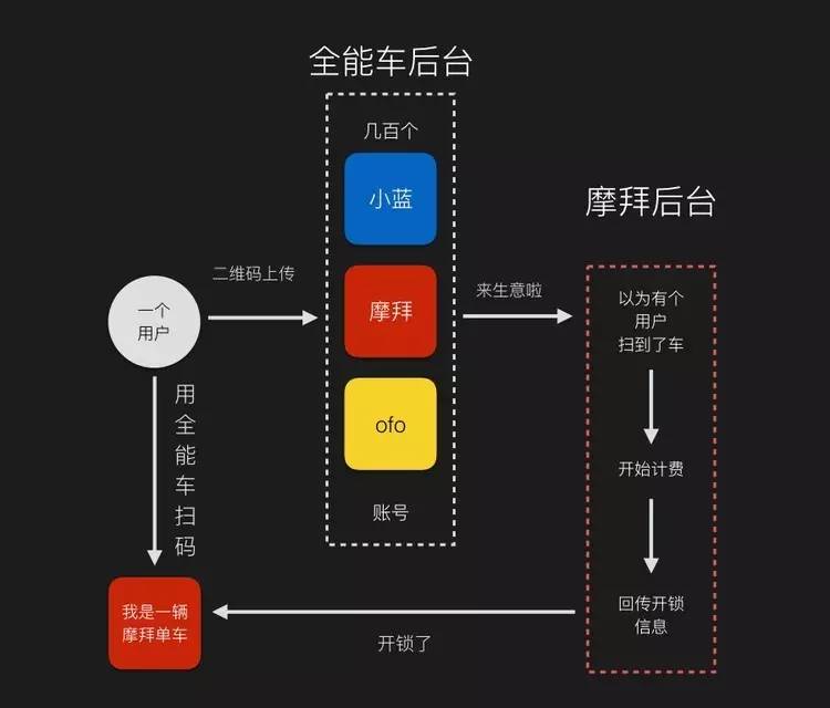 那么,“全能车”到底是怎么打开如此多共享单车的呢?PingWest猜想了一种原理,“全能车”自己分别在11家共享单车平台上注册了大量的账号,当你使用“全能车”扫描单车时,二维码信息被传到后台,然后后台随机匹配一个处于空闲状态的账号去模拟解锁操作。