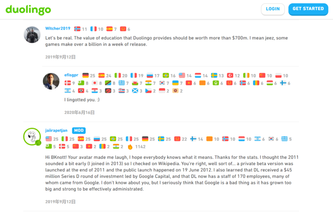 完成的课程越多,他获得的徽章也就越多;因为用户可以邀请好友一起使用多邻国,那么这些徽章也会出现在他自己多邻国的页面上,这也就成了一种社交货币(Social Currency);比如在论坛中,用户头像和名字旁边就有他学过的所有课程以及完成程度。
