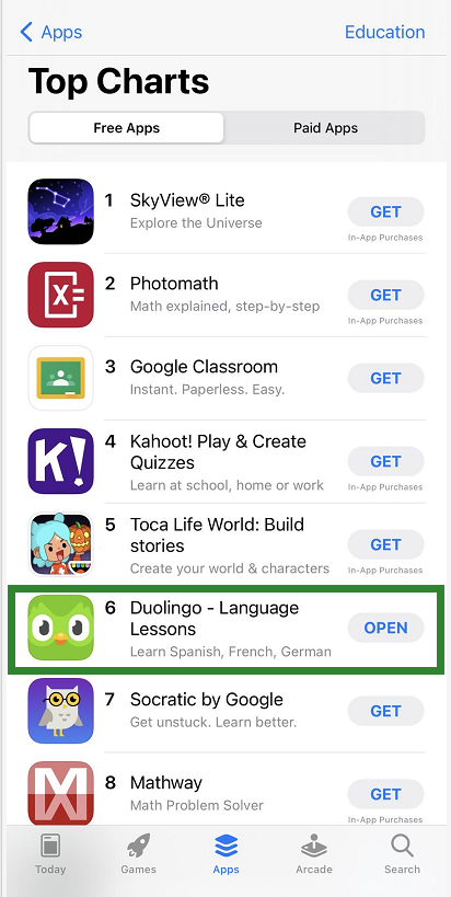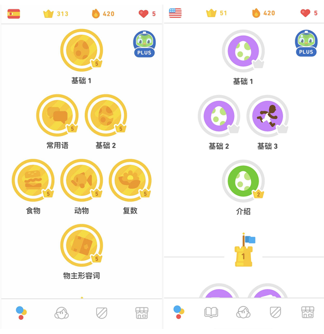 我们不妨来看看基于游戏化打造的“高粘度会员体系”,这个APP就是常年在苹果APP Store教育类榜单Top10的软件,多邻国(Duolingo)。