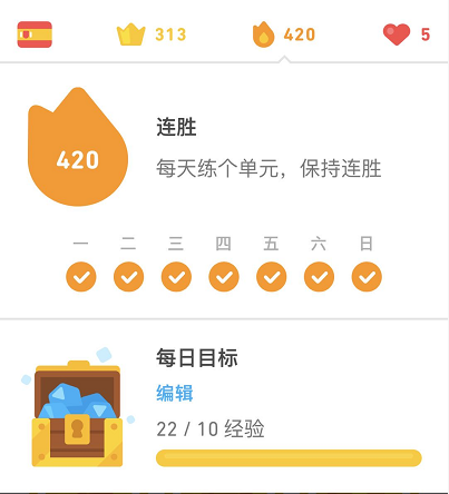 对于APP来说,每日签到是不可或缺的功能;在多邻国,只要用户当天完成1次课程,就可以增加自己的连胜记录——也就是另类的“每日签到”。