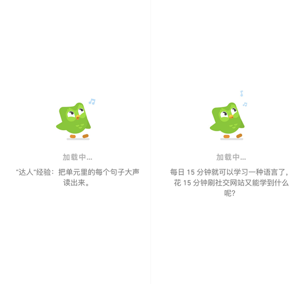 当用户载入课程的时候,多邻国会如游戏般提供一些小贴士,但是这些小贴士是有相当好的“激励性”的;其内容包括,“建议把每个句子大声读出来”、“在多邻国上学习34小时,相当于在大学学习1个学期的成果”、“每天学习、建立习惯、延长连胜”。