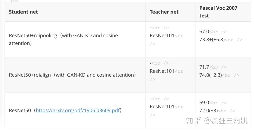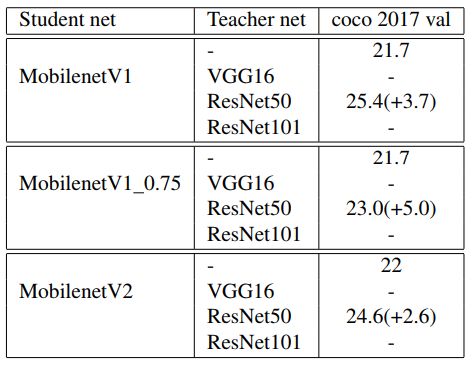 Table 3. Teacher net为骨架网络为ResNet101的faster rcnn,且使用Pascal Voc 2007 trainval作为训练集,在Pascal Voc 2007 test测试集上mAP为74.8+。第一行和第二行使用GAN Knowledge Distillation[1]方法,第三行为cvpr2019的 Distilling Object Detectors with Fine-grained Feature Imitation[2]的方法效果。