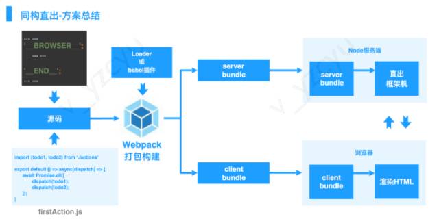 总结下,大概就是一份源码编译成两份代码。通过webpack的loader或babel插件,编译成server端运行的代码时,将__BROWSER__和__END__中间的代码去掉。