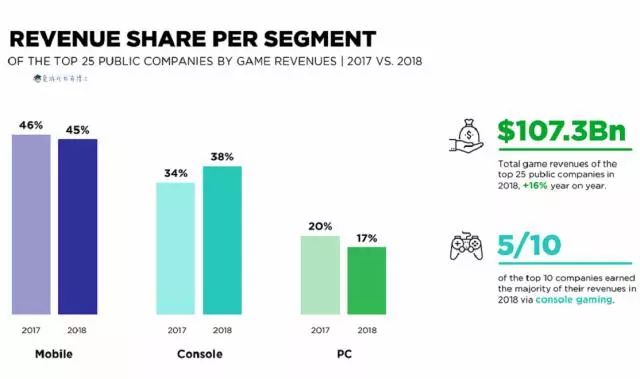游戏主机公司2018年的增长尤为强劲,占前25大公司营收的38%,高于2017年的34%。值得注意的是,在排名前10的公司,有五家公司的大部分收入来自主机游戏。主机平台的所有者索尼、任天堂和微软推动了主机的强劲表现。这在一定程度上抵消了移动端和PC端弱于预期的营收。