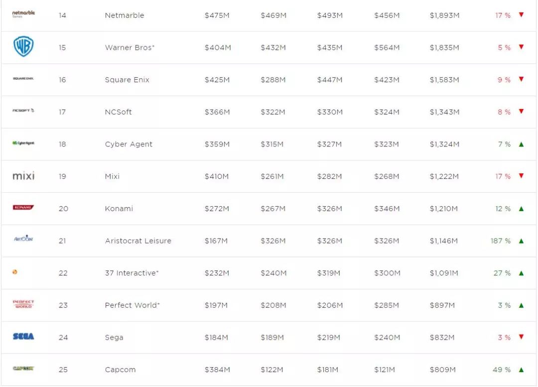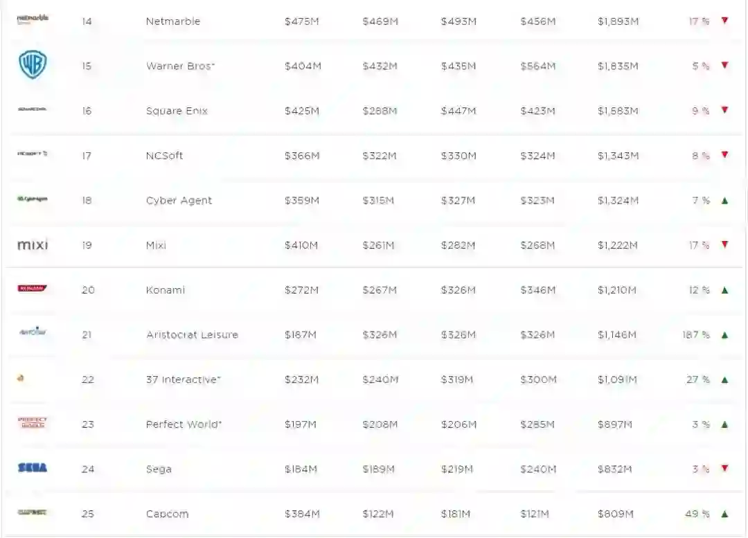 邦哥发现,位于排行榜11-25位的游戏公司,收入仅增长了6%,这个位置的顶尖游戏公司都已经很难跟上领头羊集团(1-10位)的增长速度了,诸如动视暴雪、EA、育碧等老牌游戏厂商收入增长都十分缓慢。