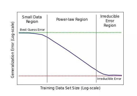 从这张示意图中可以看到,与训练数据数量的指数成线性关系的这一段把学习曲线分成了不同阶段。