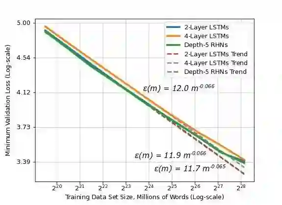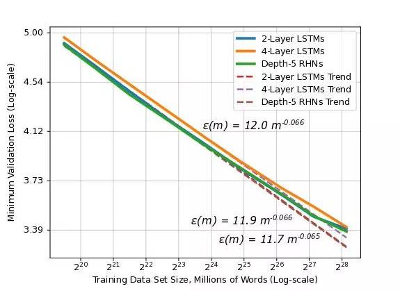 对于语言建模任务,百度研究院在 Billion Word 数据集的子集上测试了 LSTM 和 RHN 模型。上方的图中显示的就是不同数据量下每个架构模型的最佳验证误差(作为泛化误差的近似)。图中几条曲线都可以根据指数关系进行预测,甚至连幂公式中的指数都惊人地一致。对于很大的训练数据集,模型的表现会稍微偏离曲线一点,但是百度研究院的研究人员们同时发现如果优化超参数就往往可以让模型表现回到曲线上来。