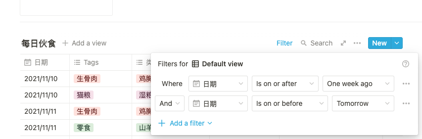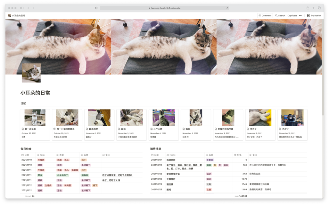 我在小耳朵的这页 Page 上建了三个 Database,分别是「日记」「每日伙食」和「消费清单」,可以算成是小耳朵的个人网站了。其中「日记」的文字就是整理 Obsidian 的内容。