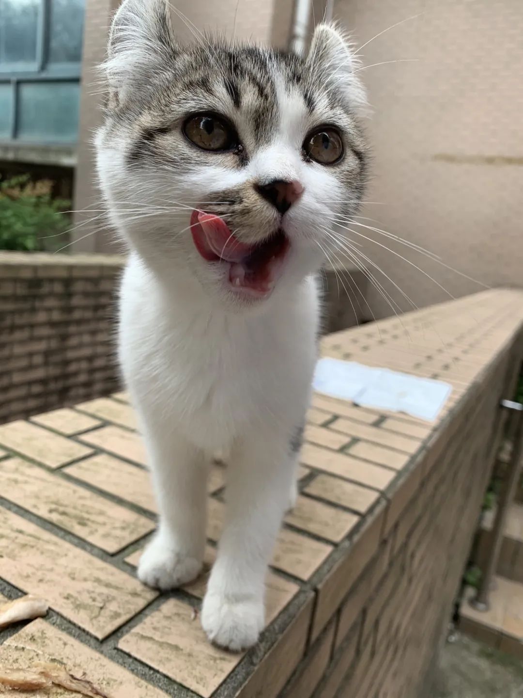 它的耳朵非常可爱,翘在小脑袋上像两颗牛角。过路的阿婆们纷纷感叹这是不是谁家养的跑了出来,我也有些疑惑。不过看它面容上的斑纹,又不像是纯种的宠物猫;再加上饥饿的样子和体态,看起来已经流浪了许久了。