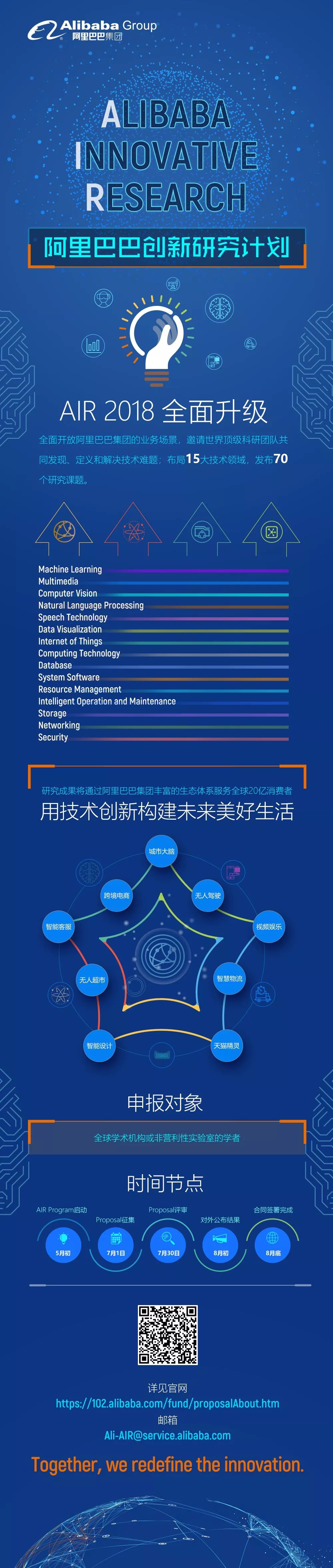 2018年AIR全面升级,除了继续深耕城市大脑等领域的技术难题,还结合无人超市、无人驾驶、智慧物流、智能设计、跨境电商等直接影响全球20亿消费者生活体验的重要场景,布局计算机科学最前沿15大技术领域,邀请全球顶级科研团队共同发现、定义、解决问题,用技术构建创新未来美好生活。