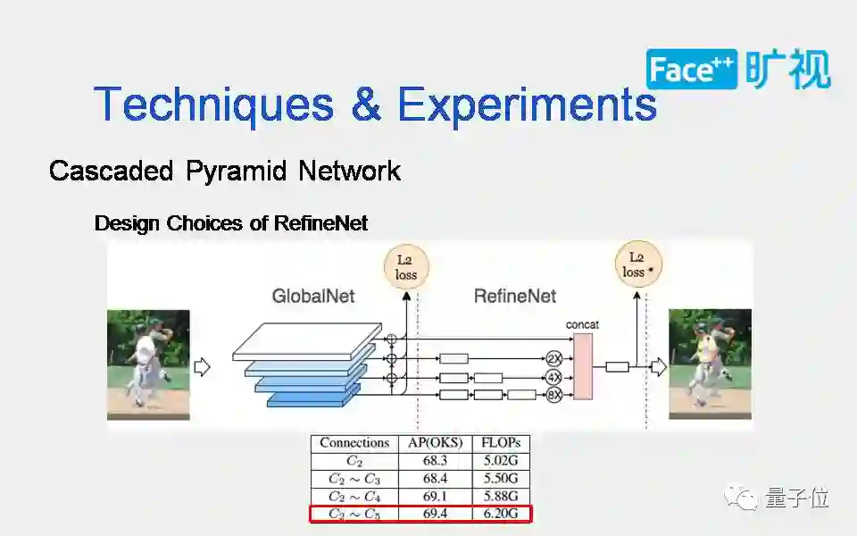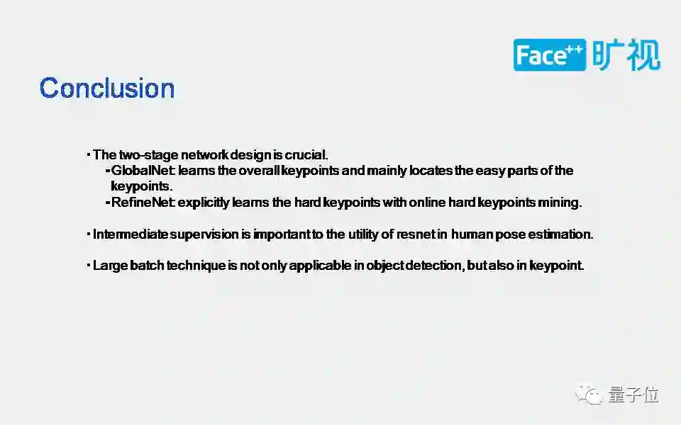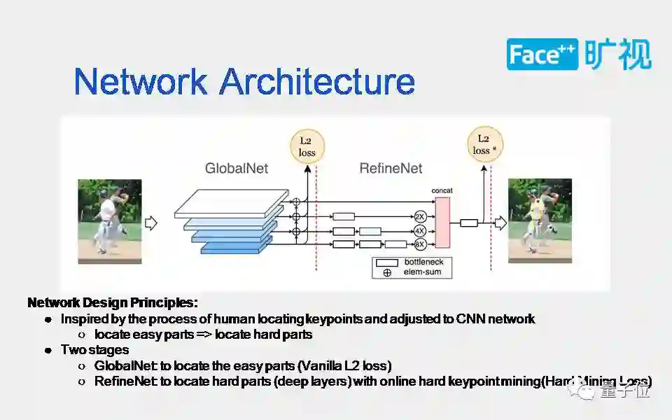 从人看关节点的过程获得启发,然后将这一启发运用到卷积神经网络里,先解决简单部分再解决难的部分。这是一个两阶段网络:全局网络和精炼网络。全局网络,主要是解好一些容易点;精炼网络,主要是定向解决更难的一些点。具体的实施方法用到了在线难关节点挖掘的算法。