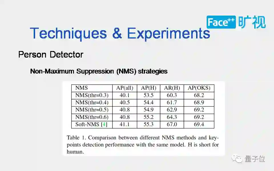 Top-down的框架是先检测人,人抠出来之后,再去做姿态估计。所以有必要对person detection(行人监测器)做一定的分析。首先解释一下非最大值抑制。现在有两种主流的方式:软非最大值抑制(Soft NMS)和硬非最大值抑制(Hard NMS),软非最大值抑制是对所有的候选框去做重新的估分,对比较差的框保留但会抑制分数。硬非最大值抑制就是将IOU超过阈值之后的分数比较差的那些框过滤掉。所以两种方式最终实现的结果是Hard NMS保留的框比较少,而Soft NMS对框的分数做了一个修改,保留了较高的召回率(recall)。