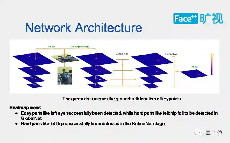这张图上,热力图可以体现出我们的网络设计原理,图上的绿点是关节点对应的ground truth。从图中左边的部分可以看出左眼作为相对容易的关节点,在前阶段的全局网络就可以解的很好。而右边的左臀部,作为相对较难的遮挡点,需要在后面的精炼网络里面才能识别出来。