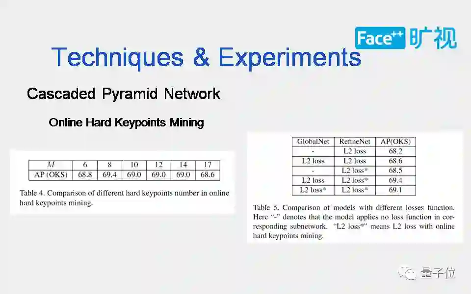 右边这个表说明了普通的L2 loss和Online Hard Keypoints Mining的loss各有什么区别。最后可以看出前面用普通的L2 loss,后面用Online Hard Keypoints Mining的loss会更科学点。