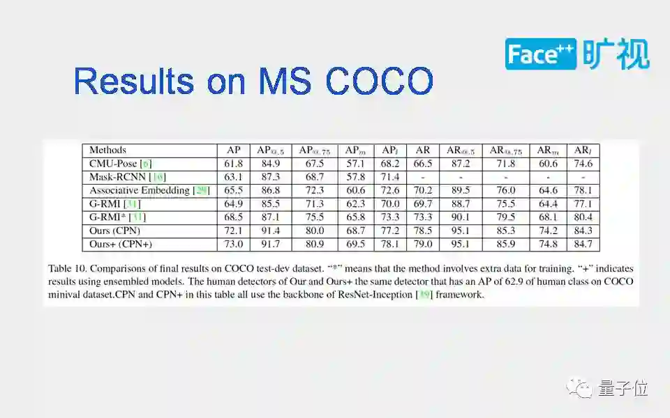基于这篇论文所提出的算法,Megvii(Face++)队在COCO2017人体姿态估计竞赛上获得了历史最好成绩,相对 2016年人体姿态估计的最好成绩提高了19%。