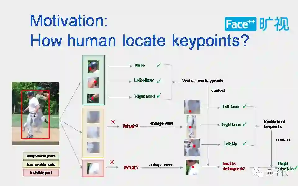 那么人是怎么样去看比较难的关节点呢?人可能会无意识地放大或者利用可见点的上下文信息来推断其他点的信息。有些点是隐藏的,不仅是被衣服遮挡,识别这一类关节点会更难,需要利用更多的上下文信息。
