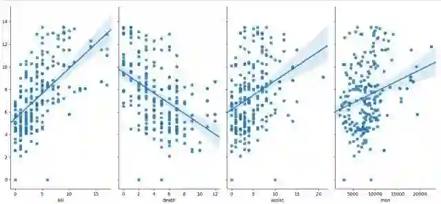 用python的seaborn包作出每个因素与分数的散点图和拟合直线和95%的置信带,如下,从图中可以看出击击杀(kill)、助攻(assist)和死亡(death)都与分数成线性关系,而金币(mon)和分数有一丝丝线性关系,但是不是太显著。