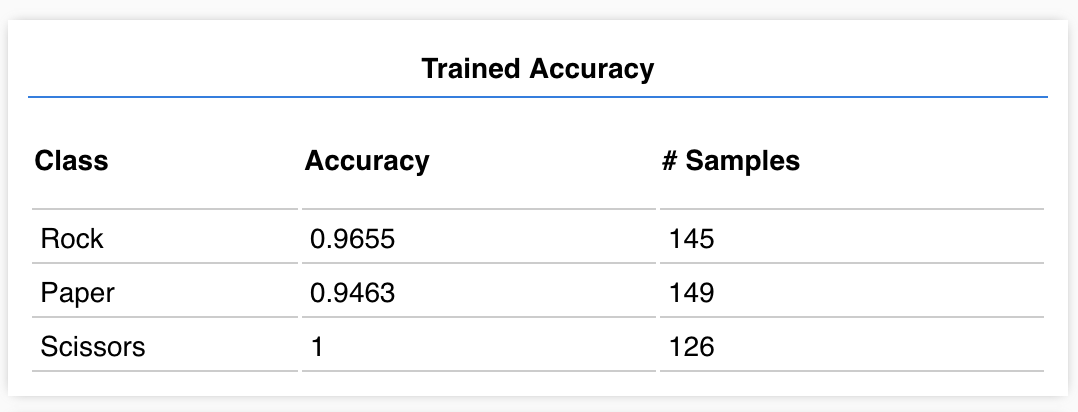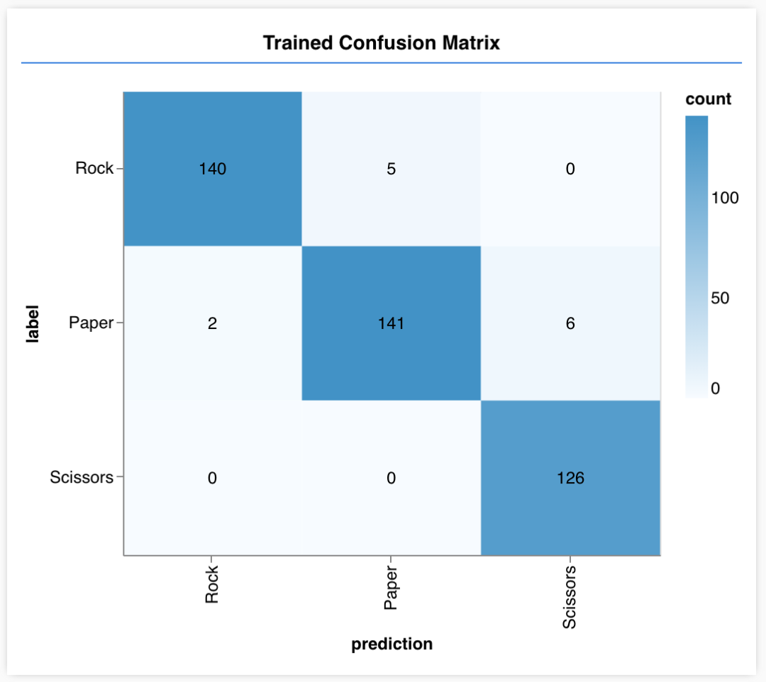 正如在这里看到的,布被意外地归类为剪刀 6 次。这是有道理的,有时候布看起来有点像剪刀。像上面这样的混淆矩阵可以帮助我们找出需要解决的问题。