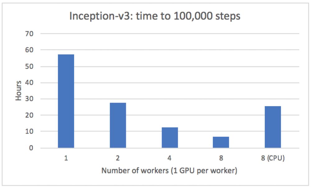 我们在 TonY 上运行了 Inception v3 模型,有 1 到 8 个线程,每个线程有一个 GPU,使用异步训练(也有一个执行在八个线程上使用 CPU 训练)。该模型是 ImageNet 的一个著名的深层神经网络,而 ImageNet 数据集包含了数百万幅用于训练图像分类模型的图像。正如在 Inception v3 分布式训练示例中一样,我们测量了批大小为 32 时,达到 10 万步所需的时间。结果如下: