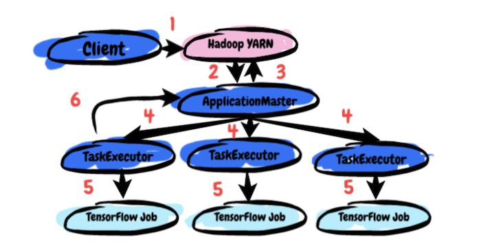 TonY 主要包含三个要素:Client、ApplicationMaster 和 TaskExecutor。运行 TonY 作业的端到端处理过程如下: