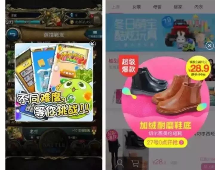 一般在应用(游戏、视频应用居多)暂停、过关、跳转、退出时以半屏或全屏的形式弹出,展示时机巧妙避开用户对应用的正常体验,用户可选择点击或忽略。