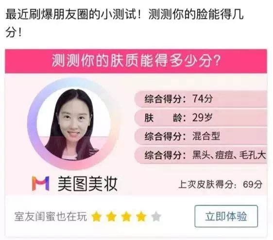 比如下图,创意内容为脸部测试,在素材选择上,利用肤龄、得分等文案,和创意需求相呼应,增强创意效果。