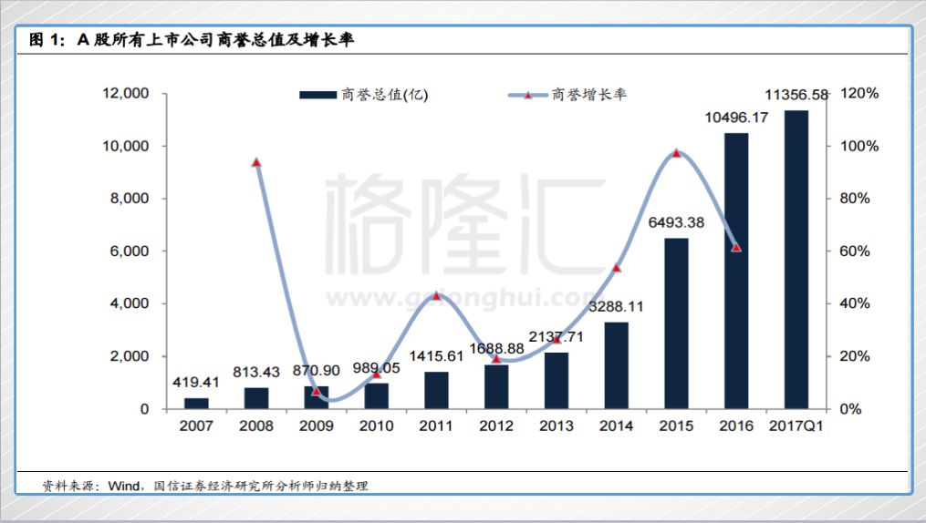 “大撒币”时代,从2007 年末到 2017 年一季度末,A 股上市公司商誉总额从419.41 亿元上升到 11356.58 亿元,10 年间增长了 25 倍。其中,2014 年之后的增速开始放大,增长势头最为明显,2015 年一年的商誉总值将近翻倍增长,不看价钱的买、买、买就是当年最炫酷的节奏。