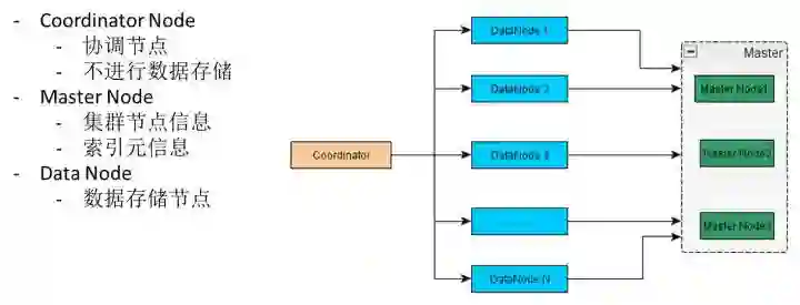 这是大体上的一个规划,当然,从左到右有一个结点,这个节点本身不存在数据的,你可以简单地认为它只是负责查询的入口。第二层用来承载具体的数据,然后这些数据的搜索本身会发生在这里。最后一层是MASTER的节点,主要是管理元数据,元数据包含有集群中的机器信息,以及写入到我的数据节点上的这些索引设置信息、索引Schema都是由Master管理。
