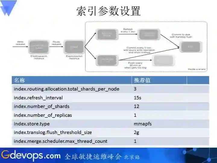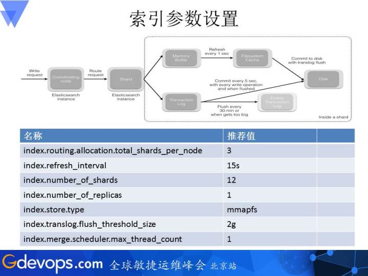 这是具体到一个索引参数的设置。在讲具体参数之前,我们可以先讲一下ElasticSearch索引参数的设置、输入以及中间发生的过程。当真正的数据请求到达ElasticSearch节点之后,它一方面会写入到内存中,另外一部分会写入到TransactionLog。